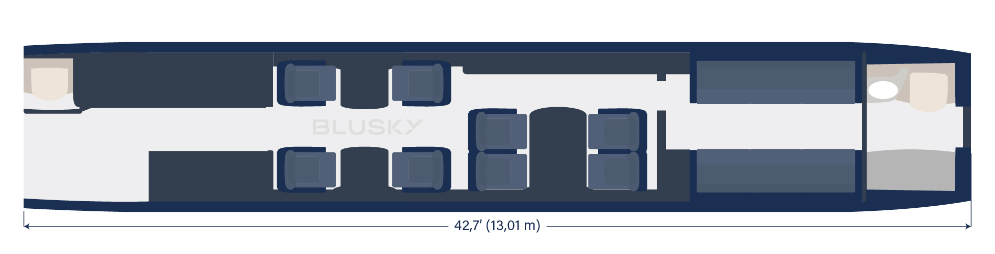 | Comprimento interno da cabine | Nos jatos, é medido da divisória entre cockpit e cabine até o local onde tipicamente fica o toalete e/ou o passageiro na posição mais traseira da aeronave. |